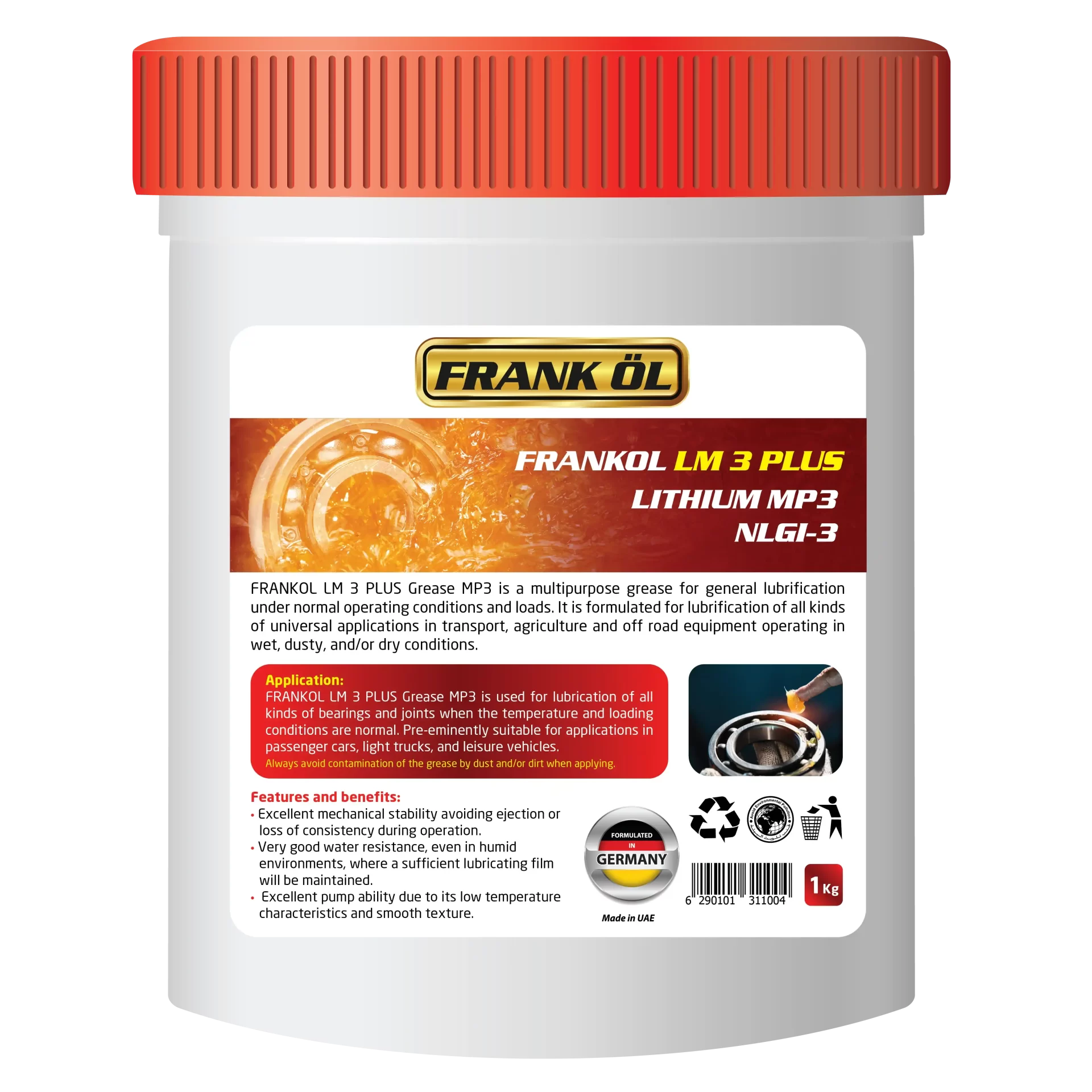 FRANKOL LM 3 PLUS EP is a Lithium thickened lubricating grease formulated with mineral base oil and improved with extreme pressure (EP) additives to lubricate and protect even in heavy loaded circumstances. Mechanically very stable and easily pumpable due to its smooth consistency.